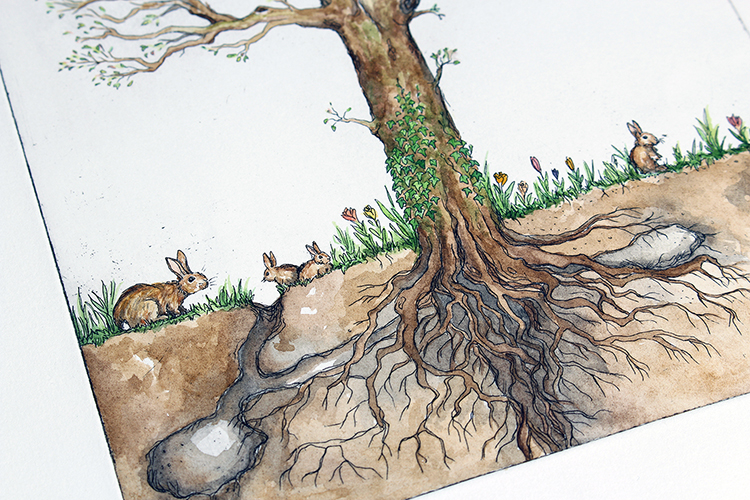 Jennie Webber is holding her original hand-painted etchings that illustrated her first published book ‘It Starts with a Seed’ this week which follows the journey of a sycamore seed through the years and seasons, as it grows into a giant old tree supporting a myriad of animal and plant life. The work will be on show at The Coalhouse, part of London’s newest nature reserve set around a wild reservoir in N16, a perfect location for the exhibition! Jennie Webber is a visual artist, printmaker and animal lover. Her practice is based upon the fact that truth is stranger than fiction, and nowhere is this more apparent than in the natural world. Working primarily with intricate etchings and playful illustrations Jennie’s artwork celebrates the diversity and complexity of nature, reflecting her lifelong curiosity for flora and fauna. The hidden elements and fine detail in her work is intended to encourage observation and appreciation for the natural world, hoping to evoke the wide-eyed wonderment associated with childhood. Themes of conservation underpin all her work; the idea being that if people are amazed by the natural world, then they will be more inclined to save it.