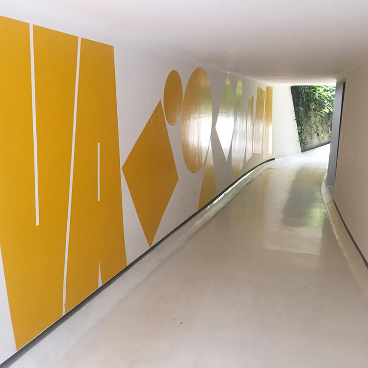 TwoPoints designed a typeface which became the heart of the Flexible Visual Identity (FVI) for “Verano Archivo”. A typeface in itself is already a FVI. It allows us to combine letters to create new forms, able to adjust adequately to context and space. The letters “VA” or the full title of the event “Verano Archivo” may be set horizontally or vertically. The letters are either yellow or can be filled with images from the exhibition. The color yellow, which represents summer, is the common thread of the FVI. It connects all the pieces of the exhibition, the inauguration lunch, the posters and the space itself, even if the typeface or the additional geometric elements aren’t used. Apart from connecting all the pieces of “Verano Archivo”, the FVI also visualised the three different elements of the event: the exhibition, the activity for kids and the activities in the open space. Each of the activities became a color and form code and were silkscreened separately on top of the letters, creating one poster for each of the activities and when printed all together, a general poster for the entire event. On the “selfie-wall”, a huge mirror in the exhibition space, the system turned into an interactive game. The visitors of the exhibition could glue the geometric forms themselves on top of the letters “Verano Archivo” and take a picture of themselves.